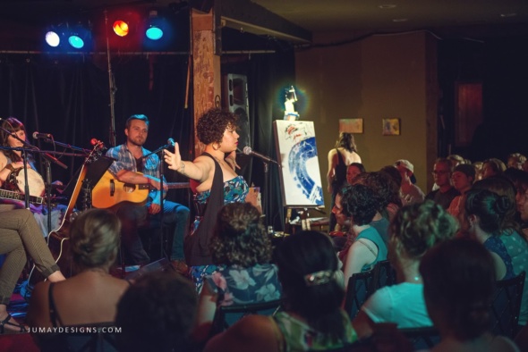 This intimate, listener-oriented event brings together 3 different songwriters (often with some backing musicians) who take turns performing their own songs before collaborating live onstage to close the show. A slam poet also performs between each “round” of songs, and a live painter or other visual artist creates a piece to the side of the stage throughout the show.
